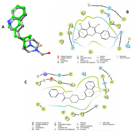 In silico docking analysis of kaempferol. (A) Rigid receptor docking (RRD) of the co-crystalized ligand at the active site of FAAH. It shows a cognate re-docked pose (green) of kaempferol compared with co-crystalized pose (elemental). (B) Kaempferol interaction with residues of FAAH active site simulated in two-dimensional (2D) plot to visualize the key interacting residues. (C) PF-750 interaction with residues of FAAH active site simulated in 2D plot to visualize the key interacting residues.
