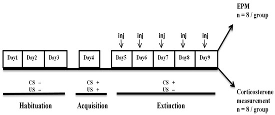 Immediately after the last extinction trial, another lot of rats (n = 8/group) was euthanized and blood samples were collected to measure corticosterone levels using ELISA kit (Abcam, OR, USA), as described in the manufacturer protocol [61].
