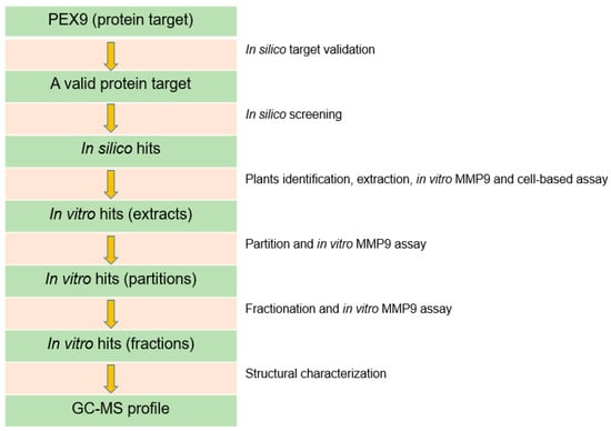 In this present study, virtual screening against PEX9 was performed as the protein target to shortlist compounds from natural product database potential in inhibiting MMP9 using in silico molecular docking. It is believed that the natural product compounds have unique structures (more chiral carbon) [26] essential for further optimization. The shortlisted compounds would then be correlated to their presence in the local plants. Eight plants were extracted using methanol and further tested for their inhibition against MMP9 in vitro. From this result, four active extracts were partitioned using four different solvents and then further in vitro screened for its activity against MMP9. The most active partitions were then subjected to fractionation using column chromatography. The collected fractions were then tested again against MMP9 and the active fraction was figured out for their chromatography-mass profile using GC-MS. To support the potency as anti-breast cancer, four active extracts were further evaluated for their inhibition against 4T1 cell, a triple-negative breast cancer cell model. For comparison to the luminal A cancer cell type, the extract was also tested to T47D breast cancer cell model. The flow chart of the studies is illustrated in Figure 1.