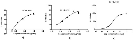 The drug dose-dependent curves of two active fractions, i.e., (a) Ageratum aerial parts, and (b) Ixora leaves and (c) NNGH as the results of FRET-based assay toward MMP9. NNGH was used as the positive control by showing IC50 47.8 nM. The bars showed the standard error of triplicate assay as previously described.
