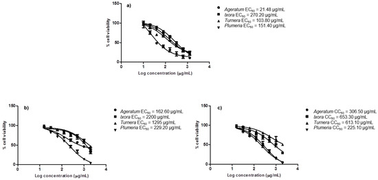 In the T47D cytotoxicity evaluation, the highest inhibition was also demonstrated by Ageratum extract with its IC50 163 µg/mL, followed by Plumeria (IC50 229 µg/mL), meanwhile Turnera and Ixora showed lower inhibition activities with their IC50, respectively 1295 µg/mL and 2200 µg/mL. To determine the safety index, cytotoxicity assay on the non-tumorigenic cell line was also conducted. The results showed that the IC50 of Ageratum, Plumeria, Turnera, and Ixora against Vero cell were, respectively, 307 µg/mL, 225 µg/mL, 613 µg/mL, and 653 µg/mL. The safety index is calculated by dividing the IC50 of extract in the Vero cell by the IC50 of extract in individual cancer cell as presented in Table 3. As shown, the safety index of Ageratum is the highest value among other extracts in both 4T1 (SI = 14.27) and T47D (SI = 1.88) indicating the least toxic of the extracts to the cells. The drug-dose response curve of Ageratum extract against 4T1, T47D, and Vero cells was presented in Figure 6.