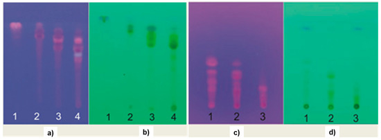 The TLC chromatogram of the fraction 1–4 of Ageratum which are detected under (a) UV365 and (b) UV254. The fraction 1–3 of Ixora are indicated under (c) UV365 and (d) UV254.