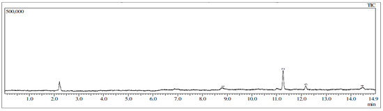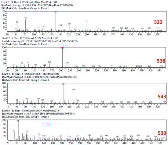 The GC chromatogram of Ageratum fraction (fraction 2) and its mass spectra are presented in Figure 8 and Figure 9, respectively. The fraction 2 was separated into four peaks having Rt as followed: Rt 8.825 min, 11.255 min, 12.175 min, and 14.460 min. These peaks were detected as compounds with the mass/ion 522, 538, 543, and 539, respectively. On the other hand, the fraction of Ixora (fraction 1) was separated into three peaks, detected at Rt 10.709 min, 12.380 min, and 14.153 min for their respective mass/ion 548, 529, and 528 (see Figure S1).
