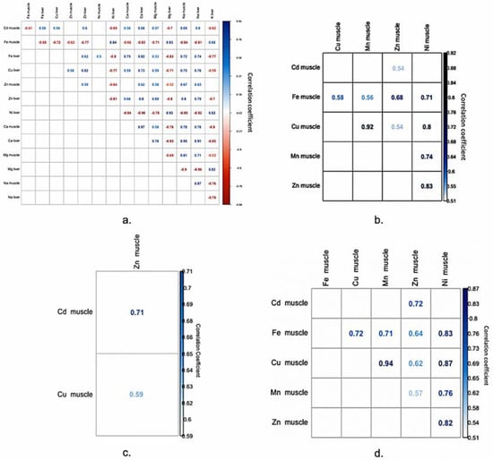 The Cu concentration in liver tissues, in the first group, is positively correlated with Ca, Na, and Zn in liver, respectively, Na in turbot muscle tissues (Figure 1a). Additionally, when considering the second and fourth groups, Cu in muscle was strongly correlated with Mn and Ni from muscle tissues (Figure 1b,d).