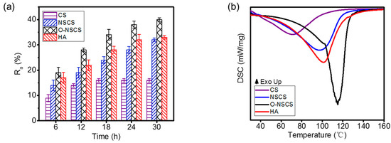 Figure 4a gives the percentage of weight increase in different dry samples (Ra). As shown, the water absorption property of NSCS had been improved to some extent, but, significantly, O-NSCS exhibited the best water absorption performance, even relative to that of HA. The weight increase of all samples reached equilibrium after 50 h. Figure 4b shows the DSC curves of different samples, in which the peaks represent the water loss temperature. The higher the water loss temperature, the stronger the molecular interaction between samples and water, which indicates a better water retention performance of the sample. Based on these results, it can be concluded that the moisture retention performance was O-NSCS > HA > NSCS > CS.