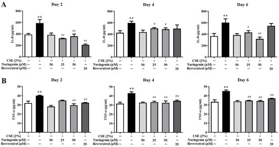2.4. Effect of Naringenin on CSE-Induced IL-8 and TNF-α Levels