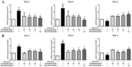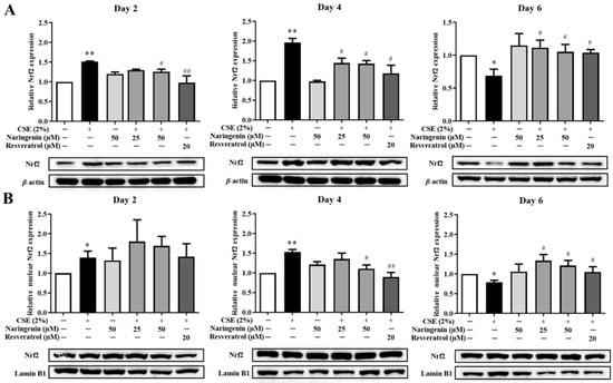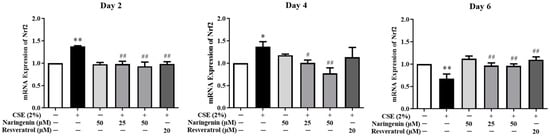 2.5. Effect of Naringenin on CSE-Induced Nrf2 mRNA and Protein Expression
