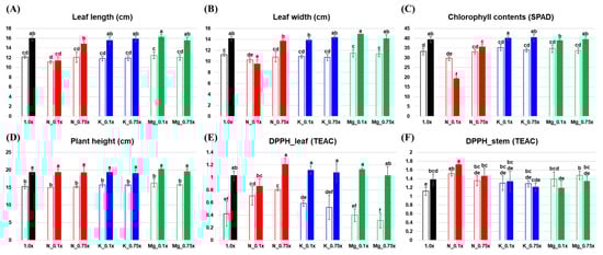 Leaf length (A), leaf width (B), chlorophyll content (C), plant height (D), and antioxidant activity (E,F) under different mineral conditions in Perilla frutescens. Empty bars represent 10 days of low mineral supply, and filled bars represent 21 days of low mineral supply. Different letters indicate significant differences according to Duncan’s multiple-range test by analysis of variance (ANOVA, p-value < 0.05). TEAC: trolox equivalent antioxidant capacity; N: nitrogen; K: potassium; Mg: magnesium.