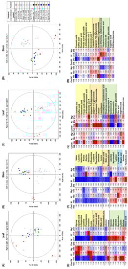 Partial least squares-discriminate analysis (PLS-DA) score plots derived from GC–TOF-MS datasets (A,B) and UHPLC–LTQ-MS/MS datasets (C,D) under different mineral supply conditions in Perilla frutescens. For the lowest mineral supply condition (0.1×), significantly altered metabolites (VIP > 1.0 and p-value < 0.05) are represented by fold change from GC–TOF-MS datasets for leaves (E) and stems (F) and UHPLC–LTQ-MS/MS datasets for leaves (G) and stems (H). Con: control; N: nitrogen; K: potassium; Mg: magnesium.