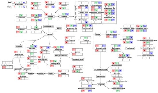 The proposed metabolic pathway under the lowest mineral supply for 21 days in Perilla frutescens. Significantly altered metabolites are represented by up and down arrows for each mineral-deficient condition depending on whether their levels increased or decreased, respectively. The pathway was modified from KEGG (http://www.genome.jp/kegg). N: nitrogen; K: potassium; Mg: magnesium.