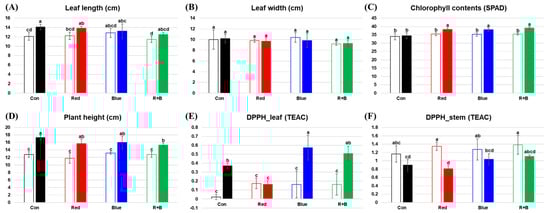 Leaf length (A), leaf width (B), chlorophyll content (C), plant height (D), and antioxidant activity (E,F) under different supplemental LED lighting conditions. Empty bars represent 10 days of supplemental LED lighting, and filled bars represent 21 days of LED lighting. Different letters indicate significant differences according to Duncan’s multiple-range test by analysis of variance (ANOVA, p-value < 0.05). TEAC: trolox equivalent antioxidant capacity; Con: control; R: red; B: blue.