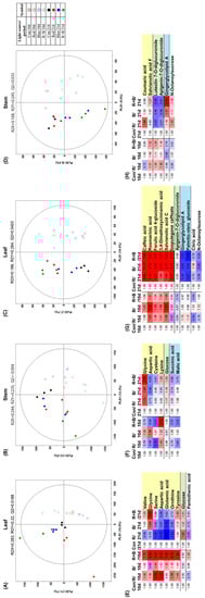 To identify the altered P. frutescens metabolites under different supplemental LED lighting conditions in leaves and stems, we also performed non-targeted metabolite profiling using GC–TOF-MS and UHPLC–LTQ-MS/MS with multivariate statistical analysis. The PLS-DA score plots from GC–TOF-MS and UHPLC–LTQ-MS/MS datasets (Figure 5A–D) exhibited distinct clustering for each group as well as for the different kinds of LED lighting and days of treatment.