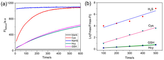 (a) Time-dependent fluorescence intensity changes at 645 nm of probe (10 μM) in the absence or presence of biothiols (30 μM) in DMSO-Tris/HCl buffer (10 mM, pH = 7.4 2:1, v/v); (b) The pseudo-first-order kinetic plot of the reaction of probe (10 μM) with biothiols (30 μM). Conditions: incubating in the room temperature for 10 min, slit: excite = emission = 5 nm, λex = 567 nm.