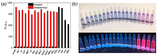 As important reactive sulfur species, small molecular biothiols, such as hydrogen sulfide (H2S), cysteine (Cys), homocysteine (Hcy) and glutathione (GSH), play important roles in physiological activities and pathological processes [1,2]. The abnormal levels of intracellular biothiols are closely related to many diseases, including neurotoxicity, cardiovascular diseases, liver damage, Alzheimer’s disease, cancer, and so on [3,4,5]. Therefore, developing hypersensitive methods of detecting biothiols is urgently required, which would be of great assistance to explore the intracellular behavior of biothiols in living organisms and special physiological environments.
