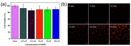 (a) Cell viability values (%) estimated by MTT versus different incubation concentrations of NRSH. Hela cells were cultured for 48 h in the presence of NRSH (6.25, 12.5, 25, 50, 100 μM); The confocal microscopic images of NRSH (10 μM) in Hela cells with time: (b) The fluorescence imaging of endogenous Cys in living HeLa cells incubated with probe.