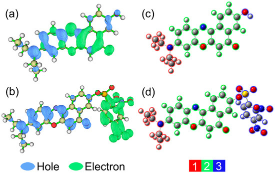 In order to provide a further insight into electron excitation properties, hole-electron distribution analyses were carried out with Multiwfn 3.6 program [53,54]. From the Multiwfn manual, the opinion, “an electron leaves hole and goes to electron”, is used to depict the process of single-electron excitation [53]. As shown in Figure 8a,b (at default isosurface value 0.002), blue and green symbolize the hole distribution and electron distribution, respectively. In addition, the structures of two molecules are divided into 2 or 3 fragments for easy understanding. It can be observed that the trends of hole distributions for NR and NRSH are very similar from fragment 1 to fragment 2. The figure clearly shows that the overall charge transfer direction is from diethylamide group (fragment 1) to the four connected six membered rings moiety (fragment 2) for NR. However, for NRSH, almost all electron (99.6%) locates on the fragment 3 (DNBS group). Obviously, the electron excitation characters of NR and NRSH are corresponding to ICT process and PET process, respectively.