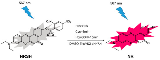 NRSH has been designed as shown in Scheme 1, and characterized by HRMS and NMR spectroscopy. The detailed spectrum diagrams of structural characterization are shown in the supporting information (Figures S1–S3). The fluorophore NR is selected due to a large long wavelength fluorophore and typical intramolecular charge transfer (ICT) process [47,48,49,50], and DNBS is introduced by esterification reaction to form NRSH, which might feature a weak fluorescence owing to a characteristic photoinduced electron transfer (PET) process. In the presence of biothiols, such as Cys and GSH etc., DNBS can be removed by mercapto nucleophilic reaction resulting in the generation of NR with strong red fluorescence emission at, 645 nm. We anticipate that the probe can be used for detecting biothiols in living cell imaging. In this report, the fluorescent probe NRSH shows to be very effective in detecting biothiols, as expected.
