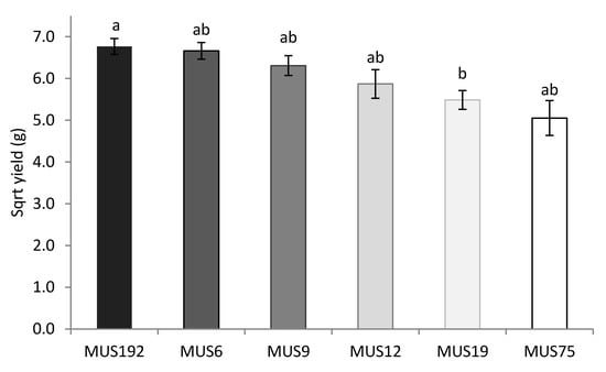 The effect of strain on the fruiting body yield is presented in more detail in Figure 1. The only significant differences on the estimated yield were observed between the strains MUS192 and MUS19 (p < 0.05). These strains presented fruiting bodies with the highest probability of success fruiting bodies in comparison with other strains (Table 1). The yields per bag were 51.3 g and 37.2 g, respectively, for the MUS192 and MUS19 strains.