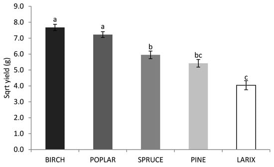 Effect of the wood substrate on the fruiting body yield of G. lucidum estimated in Equation (2). Significant differences (p < 0.05) between the square root yields are represented with different letters (a, b and c).