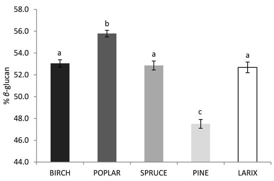 The β-glucan content of the fruiting bodies of G. lucidum was affected by the tree species used as wood substrate (Figure 4). The highest β-glucan content was estimated for the P. tremula wood-based substrate (marginal mean of 55.8% of β-glucan). The P. tremula wood-based substrate also presented a significantly higher probability of fruiting (Table 1) and fruiting body yield (not statistically different from Betula spp.; Figure 2) in comparison with the other species. The P. sylvestris wood-based substrate significantly presented the lowest content of β-glucan in the fruiting bodies (marginal mean of 47.5% of β-glucan).