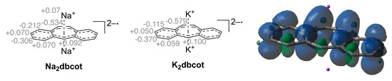 Compound Ktrop can be further reduced with potassium graphite to give the ion triple K2trop, which, apart from two K+ ions, contains the trop dianion radical trop2−• ((b) in Scheme 2). K2trop was isolated as a dark green, micro-crystalline solid. We failed to prepare and isolate the dilithium and the disodium analogue so far. The synthesis of the disodium and the dipotassium derivatives of the dbcot2− dianion, Na2dbcot or K2dbcot, is achieved in a straightforward manner by simply exposing dibenzo[a,e]cyclooctatetraene (dbcot) to elementary sodium or potassium graphite in anhydrous tetrahydrofuran ((c) in Scheme 2) as was likewise reported for the preparation of Li2dbcot [28,31].