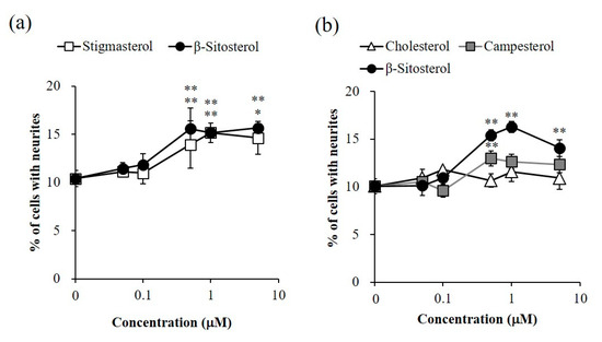 2.3. Promoting Activity of β-Sitosterol on Neurite Formation Induced by NGF in PC12 Cells
