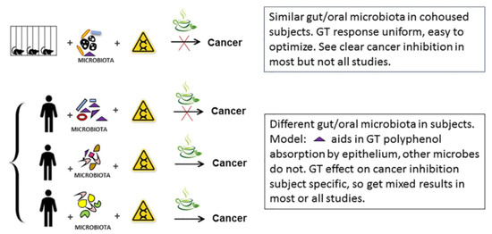 People who are non-cohabitating show a great variety of oral and gut microbiota which is reduced in those who live together [96,97]. Diet [98,99], gut/oral health [100,101], and drugs [102,103] may further influence gut and oral microbiota. Clinical studies on GT-based prevention do not normally account for variation of aerodigestive tract microbiota or the foods, beverages, and medications ingested. As a result, one would predict that responses to supplemental polyphenol and GT itself would be variable. Whether one is assaying changes in cell function [104] or histological changes in cancer-prone sites [24], rarely is a consistent net positive result seen across a sample of human subjects. This may be due to the differences in GT metabolizing digestive tract microbes that we suggest are crucial for catechin uptake, turnover, and/or function [35,70,105]. As a result, levels of GT extract that may be appropriate for most individual humans are much too high, for example, in subjects with gut/oral microbes most efficient at converting GT polyphenols to metabolites that are bioactive. Conversely, a study on a rodent cohort consuming GT polyphenols, with bioactivity dependent on digestive tract microbiota which vary little, would reveal consistent changes in gene expression. This would ease GT dosage optimization in a rodent study and make it fairly likely that changes in cancer incidence would be observed (Figure 2). In clinical trials, using humans with variable gut/oral microbiota, that would not be the case [106]. For example, humans with high levels of gut/oral bacteria that metabolize GT polyphenol to functional, readily absorbed metabolites might show toxicity, while those with gut/oral bacteria that lack this metabolic activity may show no effect [26]. With heterogeneous populations, a dosage would be chosen tolerable to all but the most sensitive subjects. It would vary little between studies and be on-average ineffective and that is what has been observed (Table 2). This is in contrast to rodent studies where levels of catechins given to experimental subjects vary between studies (Table 1). One possible solution is to artificially convert GT polyphenols to forms that are more readily absorbed by cells [35,107]. Another would be to characterize subject specific GT toxicity, possibly by measuring each subject’s gut/oral microbiota and its ability to activate and inactivate GT catechins, prior to entry in the trial, or more directly measuring GT metabolites after the study starts.