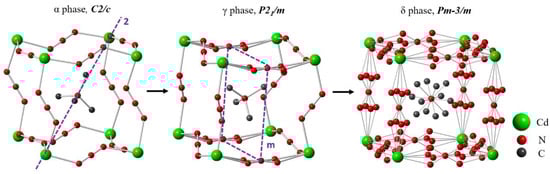 Perspective view of the crystal structures of the α, γ and δ phases of [(CH3)4N][Cd(N3)3]. Cd, N and C atoms are shaded in green, red and dark gray, respectively.
