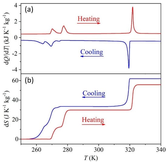 DSC measurements confirm that the compound undergoes three reversible structural phase transitions as a function of temperature with Theating/Tcooling = 270/263, 277/270 and 322/319 K, with an overlap of the peaks of the first two transitions (α→β and β→γ) and a sharp peak regarding the ferroelastic transition (γ→δ) (see Figure 2a). From the area under the peaks, we have obtained the isobaric enthalpy change ∆Hib for the α→β→γ transitions, which were analyzed jointly, and ferroelastic transition; see obtained values in Table 1. Additionally, we have also calculated the isobaric entropy change ∆Sib as a function of temperature using the following relation , where is the heat flow measured at constant pressure, is the temperature rate and is the temperature, as it is shown in Figure 2b. The isobaric entropy change as a function of temperature grows abruptly until it reaches a local maximum plateau of ~29.83 J·Kg−1K−1 at the transition α→β→γ and ~32.26 J·Kg−1K−1 at the ferroelastic transition. Therefore, the total entropy change for the three phase transitions turns to be 62.09 J·kg−1 K−1, which is in excellent agreement with the value reported in the literature [15,26].