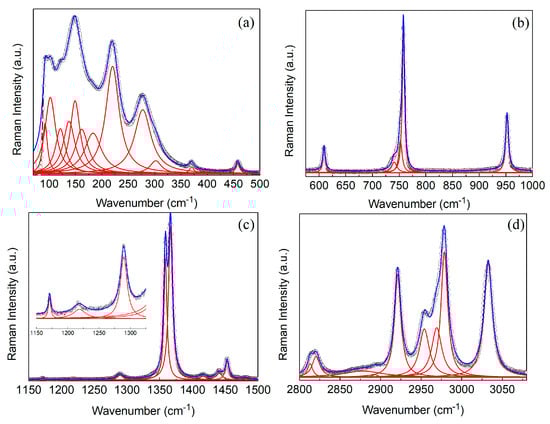 (a–d) show Raman spectra of TMACdN3 measured at room temperature in different spectral regions. The open circles are the experimental data, while the blue line is the best fit employing Lorentzian’s function. The inset at figure (c) shows a zoom of the medium-wavenumber region of the spectrum.