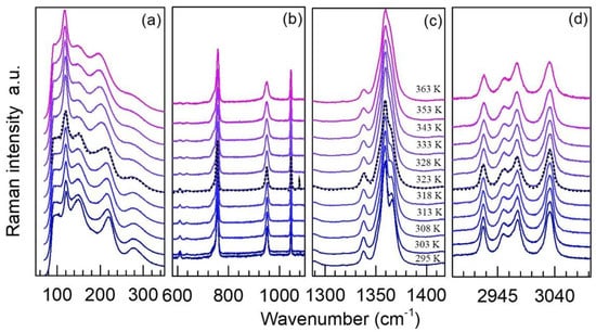 Figure 4 and Figure 5 show representative normalized Raman spectra of TMACdN3 from 295 K to 365 K in the frequency range 30 to 3100 cm−1 and from 80 K to 290 K in the range 50 to 3300 cm−1, respectively. In both cases, the dashed lines indicate the critical temperatures for the phase transitions according to DSC, Tγ→δ(heating) = 322 K (Figure 5) and Tγ→β→α(cooling) = 265 K, temperatures at which significant changes in the Raman spectra also occur (see below).