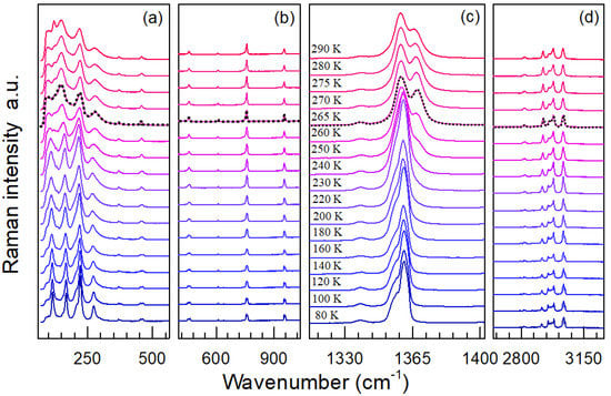 Representative Raman spectra of TMACdN3 at selected temperatures in the region of (a) 30–350 cm−1, (b) 580–1110 cm−1, (c) 1287–1418cm−1 and (d) 2901–3000 cm−1, normalized to the intensity of the highest peak and shifted vertically for better visualization and comparison. The dashed black line indicates the first-order (γ→δ) structural phase transition. In the other regions of the spectral range, as shown in Figure 5b,d, more subtle changes may be noticed and will be discussed below in more detail.