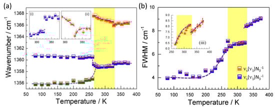 Figure 6 shows the behavior of the wavenumber and FWHM of the modes related to the azide group which can be attributed mainly to the symmetrical stretching vibrations νs(ν1)N3−. In particular, the very intense band at 1359 cm−1 is presented as the main mode because it remains present, with slight modifications, in all structural phases. As qualitatively explained before, for T < 265 K in the low-temperature phase, a splitting is observed and a new mode emerges at 1355 cm−1, while the main mode experiences a red shift to 1361 cm−1. For 265 < T(K) < 323, the main mode experiences a blue shift back to 1359 cm−1 and a new band appears at 1366 cm−1, showing the α→γ phase transition. In addition, discontinuities in the phonon energy at 1359 and 1366 cm−1 are observed at approximately 323 K (under heating), where the second structural phase transition γ→δ occurs. A strong narrowing and discontinuity in the width of the modes 1359 and 1366 cm−1 are also observed at 323 K; see Figure 6.