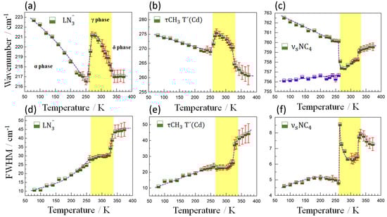 In order to perform a more detailed analysis of the behavior of the phonons during the temperature-induced multiple structural phase transitions in TMACdN3, we show, in Figure 6 and Figure 7, the behavior of the most intense modes which were more susceptible to structural changes. In addition, we also include the temperature dependence of their full width at half-maximum (FWHM), which depends on the phonon’s lifetime in the lattice and their anharmonicities. As it is well-known, FWHM is very sensitive to structural disorder, whose presence contributes to reducing the phonon’s lifetime and consequently increases the width of the spectral bands [32,33,34,35].