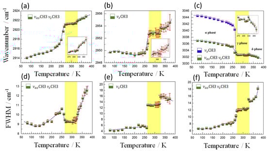 Finally, Figure 8 shows the temperature dependence of the wavenumber and FWHM of the modes associated with the CH3 group observed at 2921, 2952 and 3032 cm−1. As it can be seen, the frequency of the 2921 and 2952 cm−1 modes has a very similar behavior with temperature, characterized by the anomalous hardening of these modes as temperature increases. Meanwhile, those at higher frequencies (3032 cm−1) follow the expected behavior as a function of temperature, even if with a sharp jump at the phase transitions.