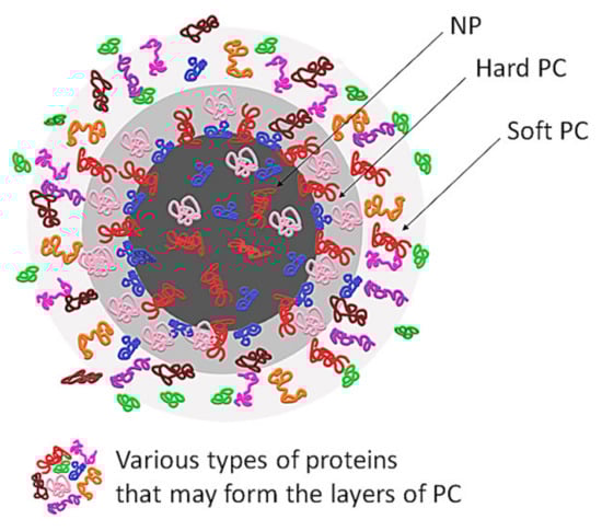 The chemical structure of the PC and the kinetics of changes of its configuration depend on the affinities of proteins towards the functional groups located on the surface of NPs, but also on the proteins’ concentration. Proteins that adsorb with high affinity form the “hard” corona—which consists of tightly bound proteins that are not easily desorbed—and proteins that adsorb with low affinity form the ‘soft’ corona, which consists of poorly bound proteins [21,22,23] (see Figure 2).