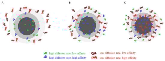 (A) Initiation of formation of PC (seconds after the NP reaches the biological fluid); (B) Beginning of exchange from the PC of proteins with low affinity with proteins that have higher affinity (seconds to minutes); (C) stabilized PC, with proteins with high affinity occupying the first layer of PC (hard PC) and the majority of the second layer (soft PC) where proteins with low affinity are still present.