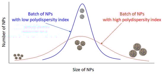 The heterogeneity of a sample based on size is measured by the polydispersity index (PDI) (Figure 6). Polydispersity occurs due to size distribution or aggregation of the sample during storage or analysis [60]. The PDI of a polymer is measured by dividing the weight average by number average molecular weight and it ranges from 0 to 1 [61]. The closer to 0 a PDI value, the more homogenous the nanoparticle solution, while values above 0.5 indicate that a NP solution is heterogeneous [62]. The PDI of the chitosan-based NPs presented in Table 1 ranges between 0.009 [39] and 0.48 [46]. As the value of this parameter influences the drug release kinetics and cellular uptake in drug-delivery applications of NPs, it seems important to choose an appropriate preparation method of chitosan-based NPs in order to obtain a low polydispersity and a homogeneous product [63].