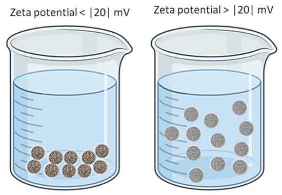 One important parameter that characterizes NPs (in fact all colloidal systems) is the zeta potential. Its value can be positive or negative and represents an appreciation of the stability of the NPs in the given environment. At low values of zeta potential the system is unstable and the NPs can cluster and precipitate. As a rule, when the zeta potential is larger than 20 (either positive or negative) there is a good chance that the system is stable, i.e., the NPs are in suspension in the liquid microenvironment [67]. Figure 7 illustrates the influence of the zeta potential on nanoparticle solutions.