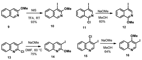 We also prepared some bicyclic iodo-methoxypyridine analogs (Scheme 2), namely isoquinolines 10, 12 and quinolines 14, 16. Compounds 12, 14, and 16 were prepared analogously to the methoxypyridines, reacting the appropriate chloro-iodo heterocycle (11, 13, 15) with sodium methoxide. 4-iodo-3-methoxyisoquinoline (10), on the other hand, was prepared by the electrophilic iodination of methoxyisoquinoline 9 using N-iodosuccinimide, and 10 was isolated in 93% yield.