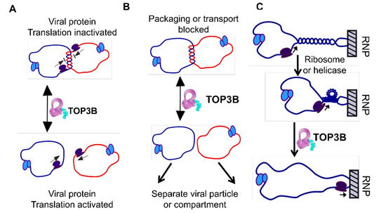 Some of the potential topological problems during the life cycle of a positive-sense single-stranded RNA virus that may require the RNA topoisomerase activity of human TOP3B. Genome circularization can be mediated by RNA–RNA interactions and proteins binding to the 5′ and 3′ ends. Decatenation of the catenated circular viral genome by TOP3B is required to remove blocks of (A) viral protein translation, (B) viral RNA transport and packaging. (C) When a translating ribosome or a helicase unwinds a duplex region in a viral RNA hairpin, and if the hairpin is bound to an immobile RNP or cellular matrix, the helical torsion will need to be relaxed by TOP3B. The figure is modified from a published version for potential TOP3B action on mRNA in [29].