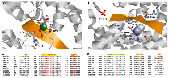 Type IA and type IIA topoisomerases require divalent ions for catalytic activity. At the active sites of these topoisomerases, divalent ions are coordinated by the TOPRIM motifs (with a conserved glutamate and two conserved aspartates DxD) also seen in many nucleotidyl transferases/hydrolases [78]. In the crystal structure of M. tuberculosis topoisomerase I [62], one Mg2+ ion is coordinated with the negatively charged carboxylate side chain of Glu24 (corresponding to Glu9 in E. coli topoisomerase I, Figure 3A) and Glu111 directly, and to Glu113 indirectly through a water molecule, in addition to the scissile phosphate. The positive charge of Mg2+ can help to position the 3′-OH of the cleaved G-strand for a nucleophilic attack on the phosphotyrosine linkage and stabilize the transition state for DNA rejoining. The DNA cleavage also became Mg2+ dependent when the first aspartate of the DxD TOPRIM motif was mutated to asparagine without the negatively charged side chain [59,79]. Overexpression of the D111N mutant topoisomerase I is toxic to the cells because of deficiency in DNA religation resulting in the accumulation of the cleavage complex on chromosomal DNA. The D111N mutation in the E. coli topoisomerase I N-terminal core domain fragment enabled the isolation of the covalent complex formed with cleaved oligonucleotide for structural determination [60]. Other mutations that affect Mg2+ binding at the active site of bacterial topoisomerase I also resulted in bacterial cell death when the mutant topoisomerase I was overexpressed because of the inhibition of DNA religation and accumulation of DNA breaks [79,80,81,82]. The requirement for DNA religation is more stringent than for DNA cleavage because both the phosphotyrosine linkage and 3′-hydroxyl nucleophile have to be placed exactly at positions required for DNA rejoining to take place.
