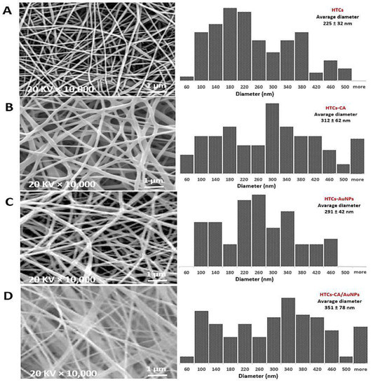 SEM images of the nanofibers mats and different diameter distribution represent changes in morphology and nanofiber diameter of the HTCs mat due to its enriching with the capsaicin, AuNPs and their combination (capsaicin/AuNPs). (A) HTCs, (B) HTCs-capsaicin, (C) HTCs-AuNPs and (D) HTCs-capsaicin/AuNPs. (CA refers to capsaicin).