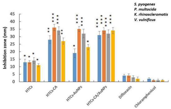 The antibacterial activities of the developed HTCs, HTCs-capsaicin, HTCs-AuNP, and HTCs-capsaicin/AuNP mats were estimated and compared with those of difloxacin and chloramphenicol antibiotics, which served as the positive control. Blend suspensions were evaluated to determine their antibacterial activities against Pasteurella multocida, Klebsiella rhinoscleromatis, Staphylococcus pyogenes, and Vibrio vulnificus. Each tested bacterial specie was cultured on a separate Petri dish (MatTek, Ashland, MA, USA) containing Muller–Hinton agar (Qiagen, Mississauga, ON, Canada). Three wells were made in each dish, into which 0.5 mL of each blend suspension was injected. Afterward, the Petri dishes were incubated for 48 h at 37 °C. After the incubation, the inhibition zone was measured and compared with that of the antibiotic materials.