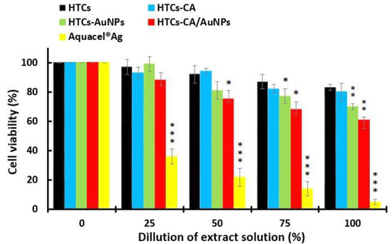 The cytotoxicity of the developed HTCs, HTCs-capsaicin, HTCs-AuNP, and HTCs-capsaicin/AuNP nanofibrous mats, and Aquacel® Ag, was evaluated via MTT tests. Cultured Vero cells were subjected to various doses of the extract suspension of all the developed mats (25, 50, 75, and 100%). The cytotoxicity index was then calculated by evaluating the viable cell value after 48 h (Figure 3). The HTCs and HTCs-capsaicin mats showed the highest cell viability rates, at 83 and 80%, respectively, in the treatment of 100% extract suspension. Conversely, the HTCs-AuNP and HTCs-capsaicin/AuNP mats were associated with significantly lower cell viabilities of 70 and 61% (P < 0.01), respectively (Figure 3). The commercial wound dressing of Aquacel® Ag showed noticeable cytotoxicity at all mentioned dilutions (P < 0.001) (Figure 3). A cell viability assay was conducted by treating the Vero cells with the developed HTCs, HTCs-capsaicin, HTCs-AuNP, and HTCs-capsaicin/AuNP nanofibrous mats in addition to Aquacel® Ag dressing using an MTT test. Most levels of proliferation and cell viability are related to HTCs and HTCs-capsaicin. The addition of the capsaicin extract to HTCs-AuNP nanofibers reportedly increases their viability and cell proliferation levels [22,57,58].