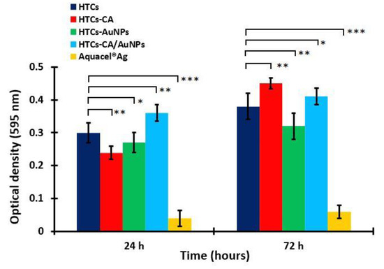 The cellular proliferative efficacy of the prepared HTCs, HTCs-capsaicin, HTCs-AuNP, HTCs-capsaicin/AuNP mats, and Aquacel® Ag (as the positive control) was determined. Vero cells were seeded (1 × 104 cells/well) on the examined samples and incubated differently for 24 and 72 h. At each time point, the estimated samples were transferred from the primary plate to a new plate with fresh media and MTT solution (100 µL/well) and incubated for 4 h. DMSO was used to dissolve the obtained formazan crystals, and the OD was calculated at 590 nm.