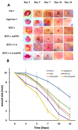 Photographic pictures of wound healing process (A) Changes curve of the wound size (B) on days 0, 3, 5, 7, 10, and 14 for the all dressings HTCs, HTCs-capsaicin, HTCs-AuNPs and HTCs-capsaicin/AuNPs in addition to the negative (con v-) and positive (Aquacel® Ag) control. (CA refers to capsaicin).