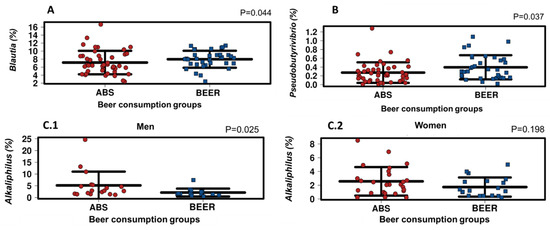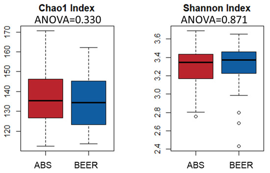 - Hernández-Quiroz, F.; Nirmalkar, K.; Villalobos-Flores, L.E.; Murugesan, S.; Cruz-Narváez, Y.; Rico-Arzate, E.; Hoyo-Vadillo, C.; Chavez-Carbajal, A.; Pizano-Zárate, M.L.; García-Mena, J. Influence of moderate beer consumption on human gut microbiota and its impact on fasting glucose and β-cell function. Alcohol 2020, 85, 77–94. [Google Scholar] [CrossRef]