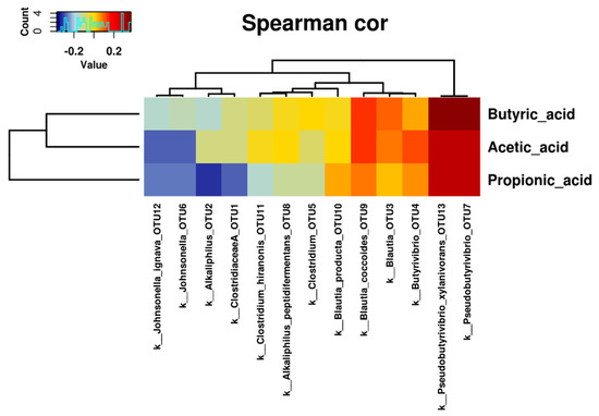 | Butyric acid (µM/g) † | 8.831 (5.383) | 11.35 (6.538) | 0.032 |