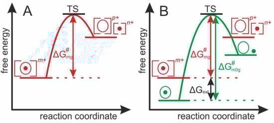 (A) Energy diagram showing the apparent Gibbs energy of activation required by charged and accelerated protein-ligand complexes to reach the transition state (TS) before dissociating into products ions. (B) Energy diagram showing the apparent Gibbs energy of activation required by charged and accelerated protein-ligand complexes () and by neutral and resting protein-ligand complexes ( to reach the transition state (TS) before dissociating into products ions.